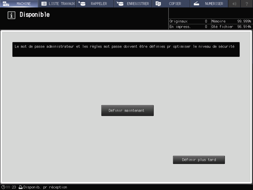 Si vous sélectionnez [Définir maintenant], l'écran [Conf.sécu.rapide] s'affiche. Contactez l'administrateur de la machine. Lorsque vous appuyez sur [Fermer], l'écran par défaut s'affiche et vous pouvez continuer d'utiliser la machine normalement.