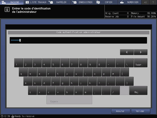Si vous sélectionnez [Définir maintenant] l'écran [Code administrateur] s'affiche. Appuyez sur [Annuler]. L'écran par défaut s'affiche et vous pouvez continuer d'utiliser la machine normalement.