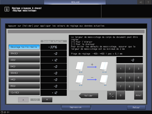 Plage de réglage : -400 ([Rétrécissement]) à +400 ([Élargissement]) (1 pas = 0,1 mm)