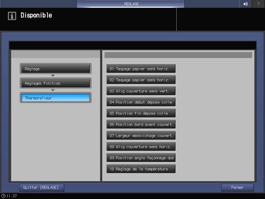Appuyez consécutivement sur [Réglages finition], [Thermorelieur] et [Position fin pose colle].