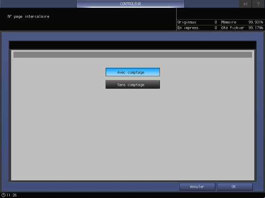 Cet écran s'affiche si vous sélectionnez [Réglage d'impression du pilote] - [N° page intercalaire] sur l'écran [Menu Configuration Contrôleur Machine]. Pour en savoir plus sur l'affichage de l'écran [Menu Configuration Contrôleur Machine], voir CONTROLEUR : réglage du contrôleur.
