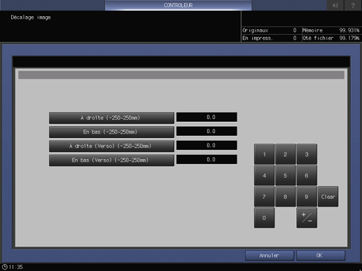Cet écran s'affiche si vous sélectionnez [Réglage d'impression du pilote] - [Décalage image] sur l'écran [Menu Configuration Contrôleur Machine]. Pour en savoir plus sur l'affichage de l'écran [Menu Configuration Contrôleur Machine], voir CONTROLEUR : réglage du contrôleur.