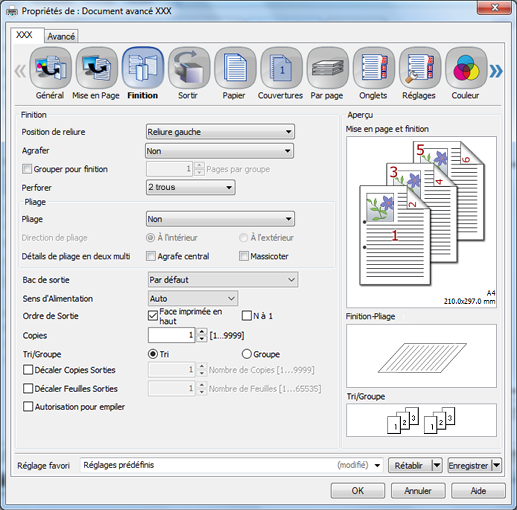 Sélectionnez la finition du document imprimé. Sélectionnez les éléments suivants et procédez aux réglages nécessaires.
