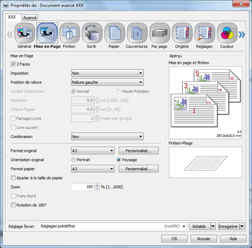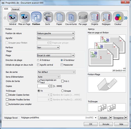 Tri/Groupe : pour imprimer plusieurs jeux, vous avez le choix entre l'impression par jeu pour par page. (Onglet [Finition] du pilote d'imprimante. Voir Finition.)