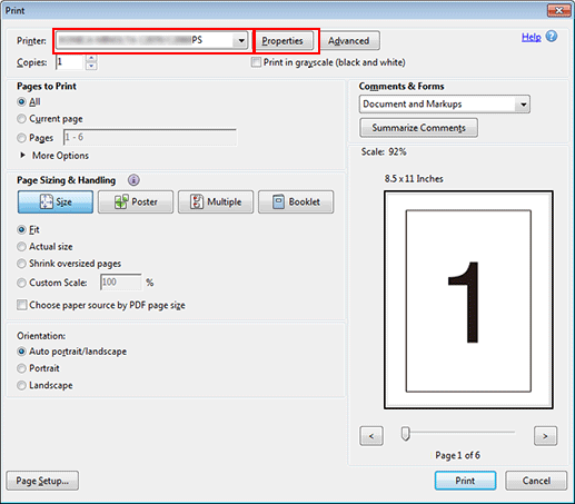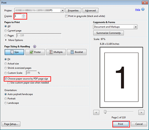 Entrez [Copies] sur l'écran [Impression]et sélectionnez [Sélection source papier par format de page PDF] et cliquez sur [Impression].