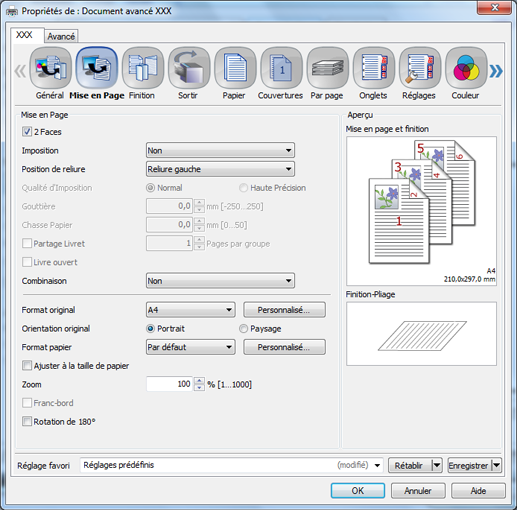 Lors de la configuration du pilote d'imprimante, assurez-vous d'avoir supprimé les réglages précédents des différents éléments des onglets [Mise en Page], [Finition], [Couvertures], etc.