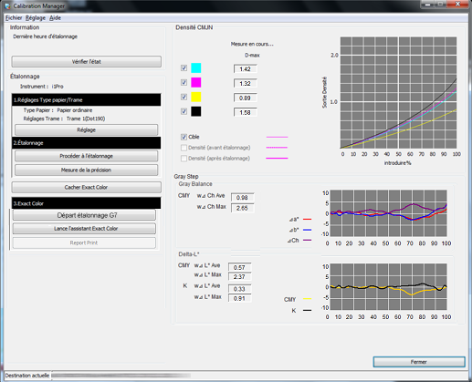 Vérifiez les résultats de mesure (densité CMJN et niveau de gris) sur l'écran [Calibration Manager].