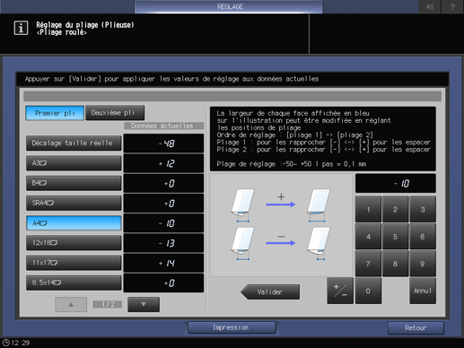 Sélectionnez le format papier et appuyez sur [Pliage 1] ou [Pliage 2]. Entrez la valeur de réglage et appuyez sur [Valider].