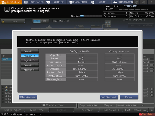 Le réglage papier du magasin sélectionné (sélection actuelle) et celui requis par les données d'impression (sélection réservée) sont affichés.