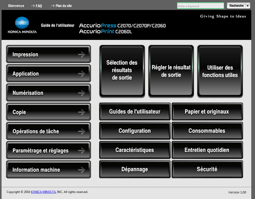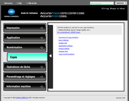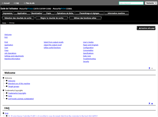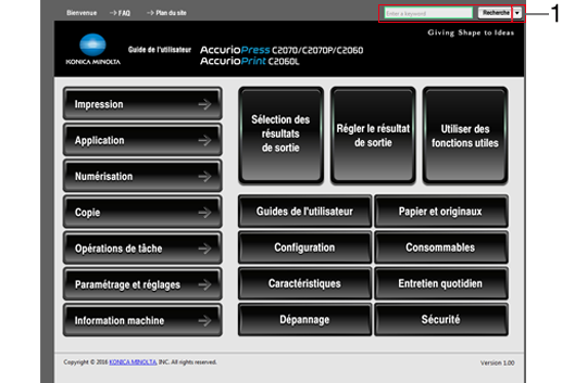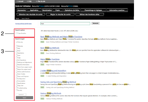 Ce champ de recherche en haut du manuel peut être utilisé pour rechercher les informations nécessaires dans le Guide de l'utilisateur. Saisissez un mot-clé dans le champ de recherche et cliquez sur [Recherche].