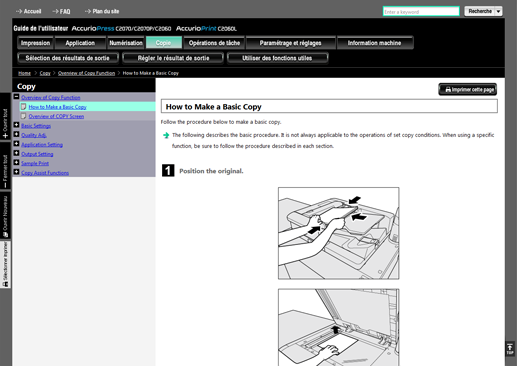 Vous pouvez utiliser cette option de recherche pour remplacer du papier et du toner en cas de problème ou dans le cadre de l'entretien quotidien, ou encore pour trouver des informations d'autres cas de manipulation de la machine.