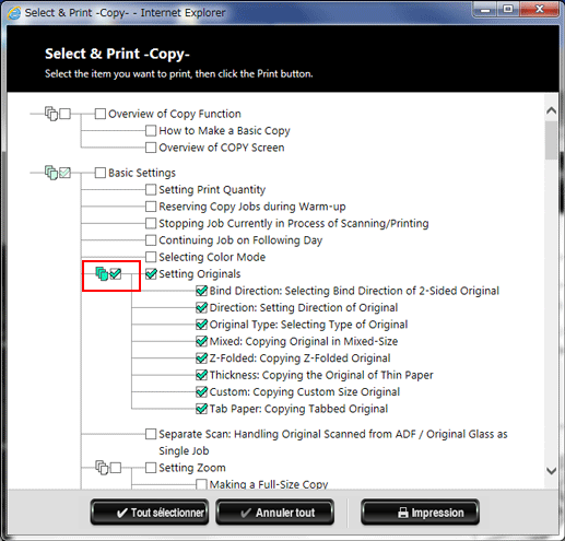 Vérifiez les titres cochés et cliquez sur [Imprimer] pour imprimer toutes les pages cochées.