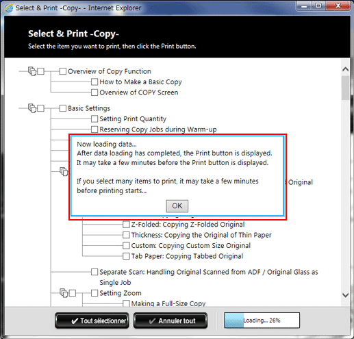 Dans certains cas le chargement de la page [Sélectionner et imprimer] met du temps à s'afficher. Si cela se produit, une fois que vous avez vérifié le contenu de la fenêtre, cliquez sur [OK] et patientez pour laisser à la page le temps de se charger.