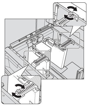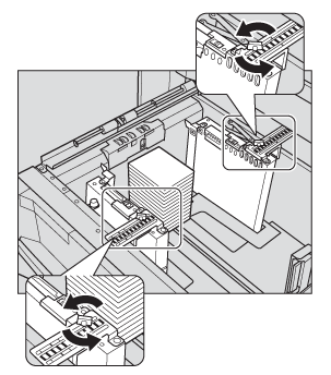 Tournez les boutons de fixation des guides latéraux des plaques-guide latérales dans le sens horaire pour fixer les guides.