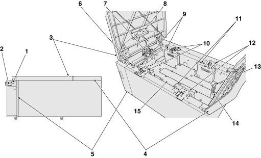 15 | Plateau inférieur du magasin | Monte à mesure que s'épuise le stock de papier. Appuyez sur le bouton d'abaissement du plateau inférieur du magasin pour le redescendre. |