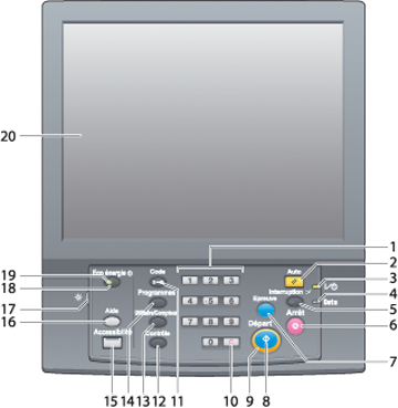 5 | Interruption | Suspend l'opération de copie/d'impression/de numérisation en cours pour permettre la réalisation d'un travail de copie urgent. La LED Interruption clignote jusqu'à ce que la machine soit prête à exécuter le mode Interruption. Lorsque la machine est prête à exécuter le mode Interruption, la LED Interruption reste allumée. |