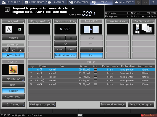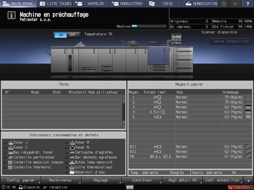 Si vous appuyez sur l'onglet [COPIER] à l'écran pendant le préchauffage, l'écran [COPIER] s'affiche. Lorsque le message [Disponible pour tâche suivante] apparaît sur l'écran [COPIER], vous pouvez définir les tâches en impression et numériser les originaux pendant le préchauffage de la machine pour permettre le démarrage de l'impression sans délai à la fin du préchauffage. Pour en savoir plus, voir Réserve de tâches de copie pendant la mise en température.