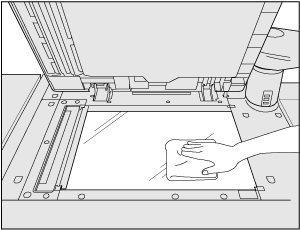 Relevez le chargeur ADF, puis nettoyez la vitre d'exposition avec un chiffon doux propre. Nettoyez la vitre d'exposition avec un chiffon doux légèrement imbibé d'eau en cas de salissures tenaces.