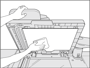 Si le cache-document du chargeur ADF n'est pas propre, les salissures peuvent être reproduites sur la copie ou bien le format original risque de ne pas être détecté correctement. Nettoyez le cache-document du chargeur ADF avec un chiffon doux propre.