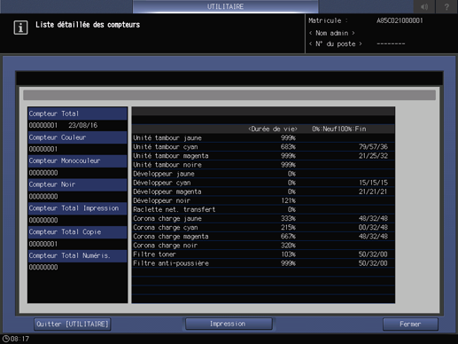 Vous pouvez également vérifier le cycle de vie du tambour, du développeur, de la courroie de transfert, de la corona de charge, du filtre toner et du filtre antipoussière. Les informations concernant ces pièces peuvent être imprimées.