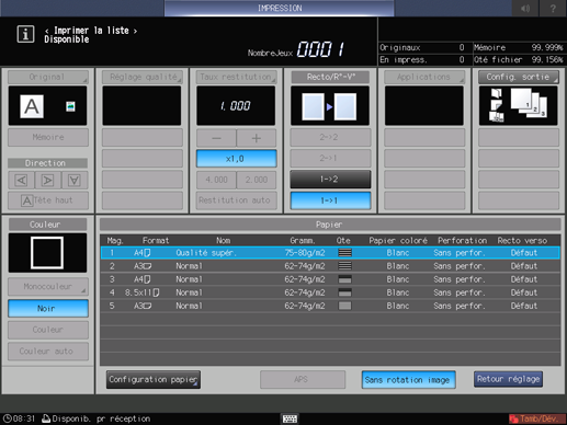 Sélectionnez Recto/Recto-verso, Réglage sortie, Magasin et Réglage papier, puis appuyez sur le bouton Départ du panneau de contrôle.