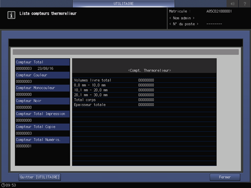 Lorsque la machine est dotée du thermorelieur PB-503, [Compteur thermorel.] apparaît sur l'écran du menu Utilitaire. La sélection de cette touche affiche le [Compteur thermorel.]. Une fois la vérification terminée, appuyez sur [Fermer].
