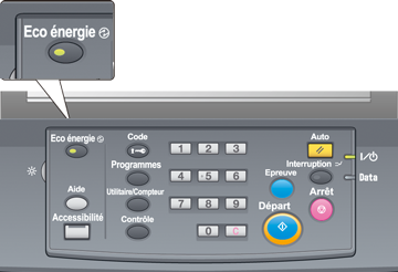 La machine est dotée de fonctions d'économie d'énergie permettant de réduire la consommation. Les fonctions d'économie d'énergie regroupent Config. fonction éco.énergie, Configuration ErP, Programmateur hebdomadaire et Eco énergie monochrome. Lorsque le voyant Eco énergie est allumé, une fonction d'économie d'énergie est en cours d'exécution et ne vous permet pas d'utiliser la machine en l'état. Pour en savoir plus sur les modalités d'utilisation, voir Annulation manuelle de l'économie d'énergie.