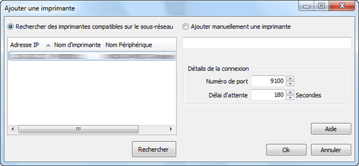 Si aucune imprimante n'est affichée, spécifiez [Numéro de port] et [Délai dép.] dans [Détails de la connexion], puis cliquez sur [Rechercher]
