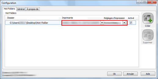 Dans [Hot Folders], sélectionnez le dossier actif cible. Dans [Imprimante] et [Réglages d'impression], sélectionnez l'imprimante requise pour le dossier actif, puis cliquez sur [OK].
