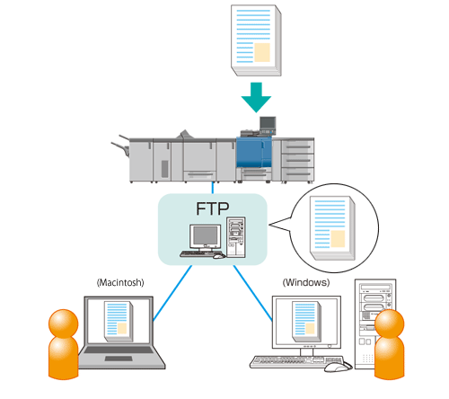 Depuis un ordinateur connecté au réseau ou à Internet, vous pouvez accéder au serveur FTP et télécharger un large volume de données numérisées même à distance de la machine.