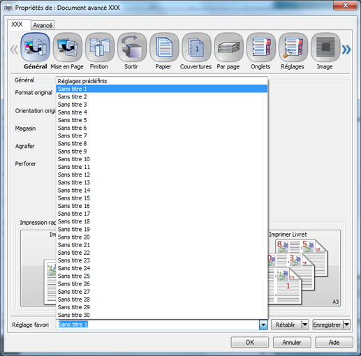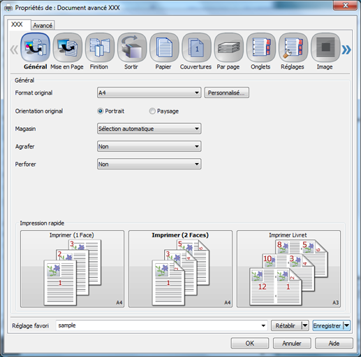Cliquez sur l'onglet en haut de la page et configurez le réglage d'impression qui convient.