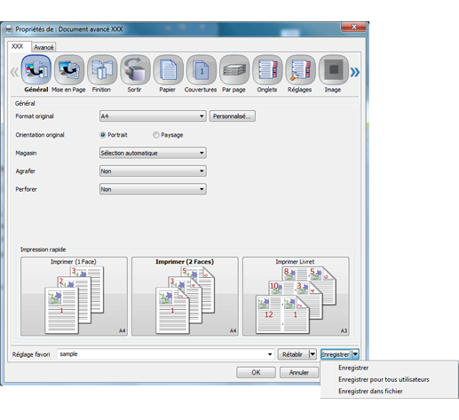 Si vous sélectionnez [Enregistrer pour tous utilisateurs] dans le menu déroulant [Enregistrer], le réglage actuel est enregistré dans le réglage favori de tous les utilisateurs lorsqu'un ordinateur est partagé par plusieurs utilisateurs. Accessible uniquement à l'utilisateur doté des droits d'administrateur.