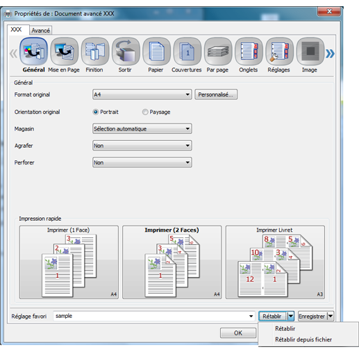 • Si vous sélectionnez [Rétablir depuis fichier] dans le menu déroulant [Rétablir], vous pouvez ouvrir les données (fichier des réglages d'impression) écrits dans le fichier et rappeler le réglage souhaité.