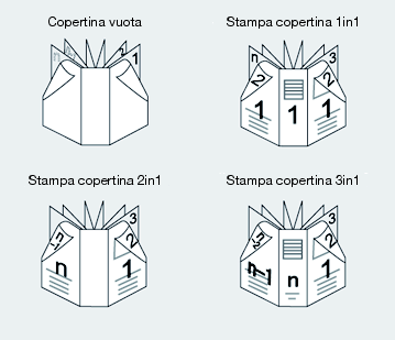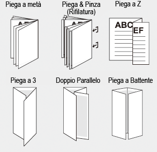 È possibile completare la carta stampata con Punto concentrato, vari tipi di Piega (Piega a metà, Piega a Z, Piega a 3, Doppio parallelo, Battente) o Rifila.