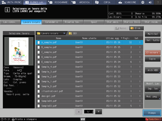 Sono visualizzati i lavori di stampa presenti nella casella.