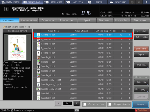 Per informazioni dettagliate sulle funzioni di modifica lavoro nella schermata [ELENCO LAVORI], fare riferimento a Modifica di un lavoro conservato.