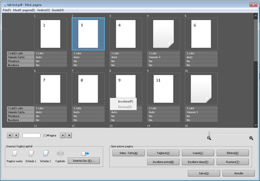 È anche possibile operare selezionando la pagina di destinazione di inserimento e selezionando [Operazione pagina] - [Incollare prima] o [Incollare dopo].