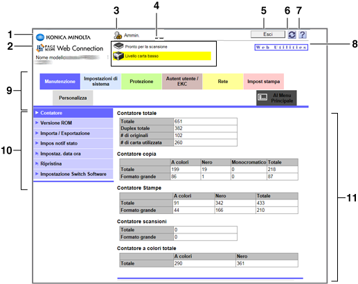 2 | Logo/nome modello di PageScope Web Connection | Per passare alla schermata in cui sono visualizzate le informazioni versione e il copyright, fare clic sul logo di PageScope Web Connection. Per passare al sito web successivo, fare clic sul logo PageScope Web Connection nella schermata. http://www.pagescope.com Il Nome modello indica il nome modello della macchina utilizzata. |