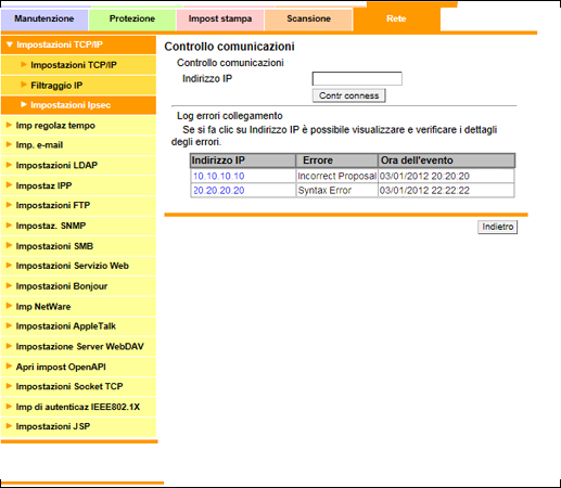 È visualizzato il risultato del controllo. Se si è verificato un errore di comunicazione, è visualizzato il messaggio [Connessione non riuscita.]. Se è presente un registro errori di comunicazione, sono visualizzati [Indirizzo IP], [Errore] e [Ora dell'evento].