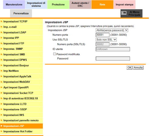 Fare clic su [Impostazioni JSP] nel menu della scheda [Rete] per visualizzare questa schermata.