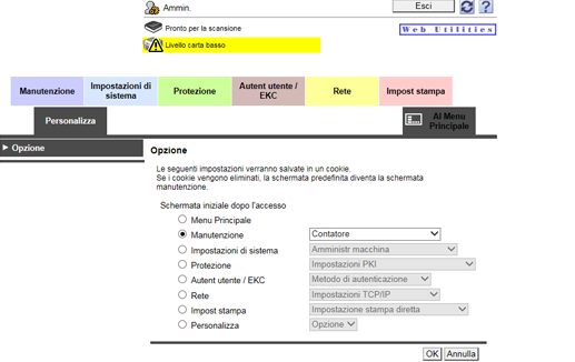 [Manutenzione] | Visualizza la scheda [Manutenzione] dopo l'accesso. È possibile selezionare quale schermata si desidera visualizzare nella scheda [Manutenzione]. |