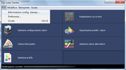 Nella schermata [Color Centro], fare clic su [File] - [Informazioni config. stampa].