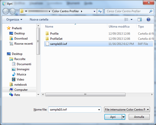 È possibile riavviare l'operazione nell'operazione della schermata di procedura guidata di Color Centro Profiler che non è stata completata ma è stata salvata come file.
