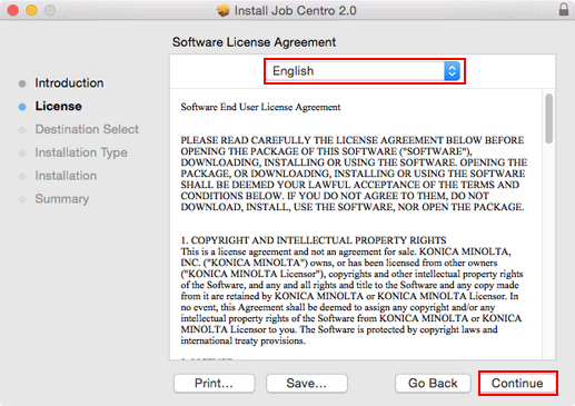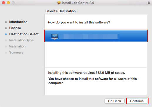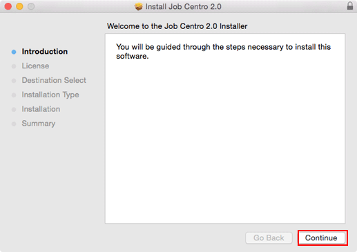 Selezionare la destinazione di installazione di Job Centro, quindi fare clic su [Continue].