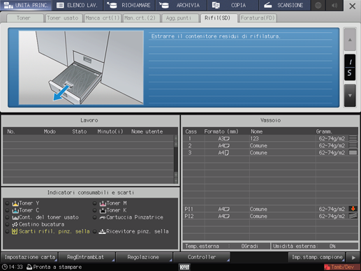 Premere la spia [Scarti rifil. pinz. sella] nell'area Indicatori consumabili e scarti della schermata [MACCHINA].