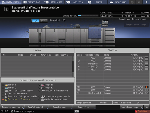 Quando il contenitore scarti rifilatura della Brossuratrice PB-503 si riempie, il seguente messaggio è visualizzato nell'area dei messaggi dello schermo.