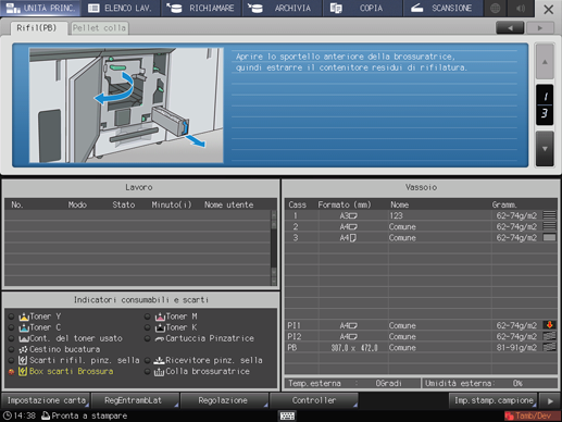 [Il contenitore scarti rifilatura della brossuratrice è pieno/Svuotare il contenitore scarti rifilatura]