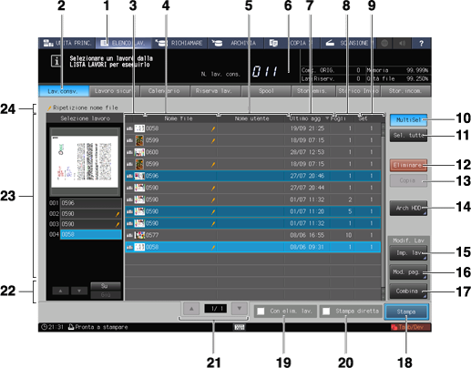 23 | Lavoro selezionato | Consente di visualizzare un'immagine di anteprima e le condizioni di emissione del lavoro selezionato nell'elenco dei lavori conservati. Se si selezionano diversi lavori conservati, è visualizzato un elenco di tali lavori. |