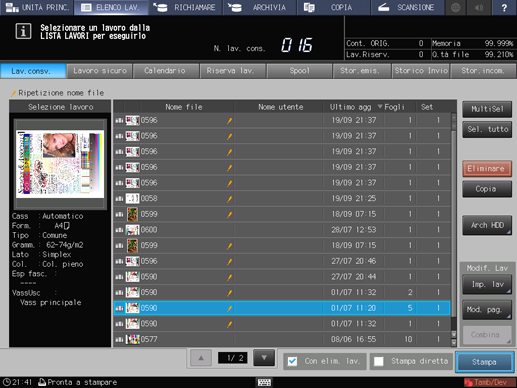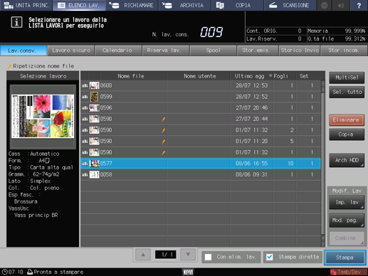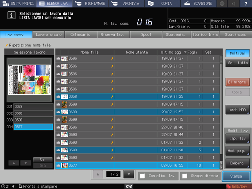 Premere [Sel. tutto] per selezionare tutti i lavori in elenco. Premendo questo tasto si selezionano tutti i lavori in elenco, ma [MultiSel] appare invece evidenziato.