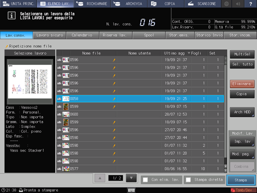La stampa è avviata dopo che i dati sul lavoro conservato sono inviati alla schermata [Lav riserv].